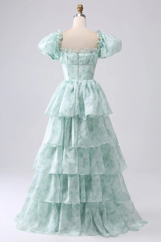 Amzcw Green A-Line Off The Shoulder Tiered Corset Prom Dress With Puff Sleeves