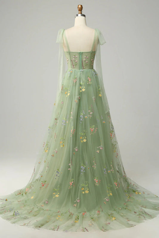 Amzcw Green A Line Spaghetti Straps Corset Long Prom Dress with Embroidery