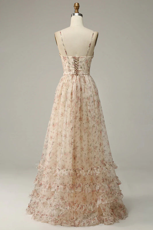 Amzcw Apricot A Line Spaghetti Straps Print Long Formal Party Dress with Slit