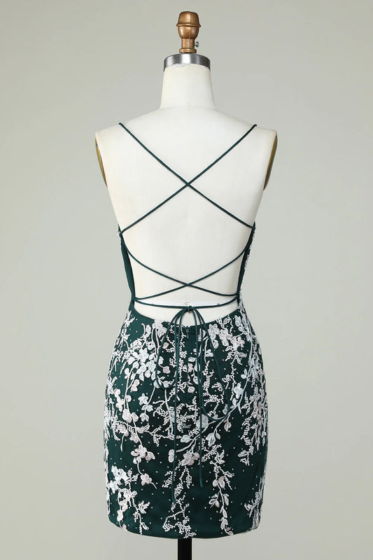 Amzcw Dark Green Bodycon Spaghetti Straps Homecoming Dress With Appliques