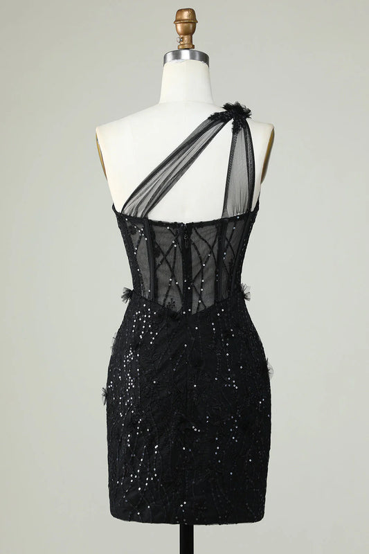 Amzcw Black Bodycon One Shoulder Corset Short Homecoming Dress with Appliques