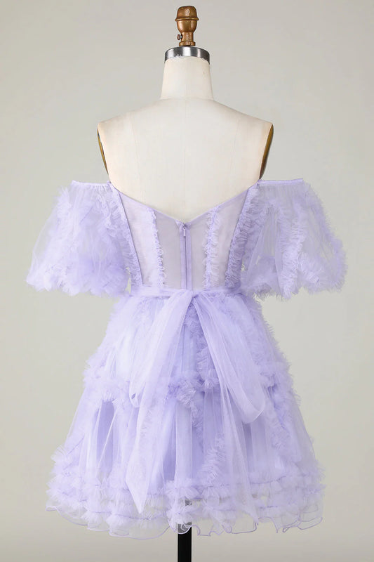 Amzcw Purple Stylish A Line Off the Shoulder Tulle Corset Homecoming Dress
