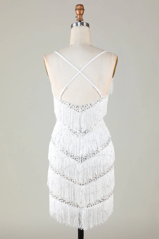 Amzcw White Bodycon Spaghetti Straps Cross Back Tassel Homecoming Dress with Sequins