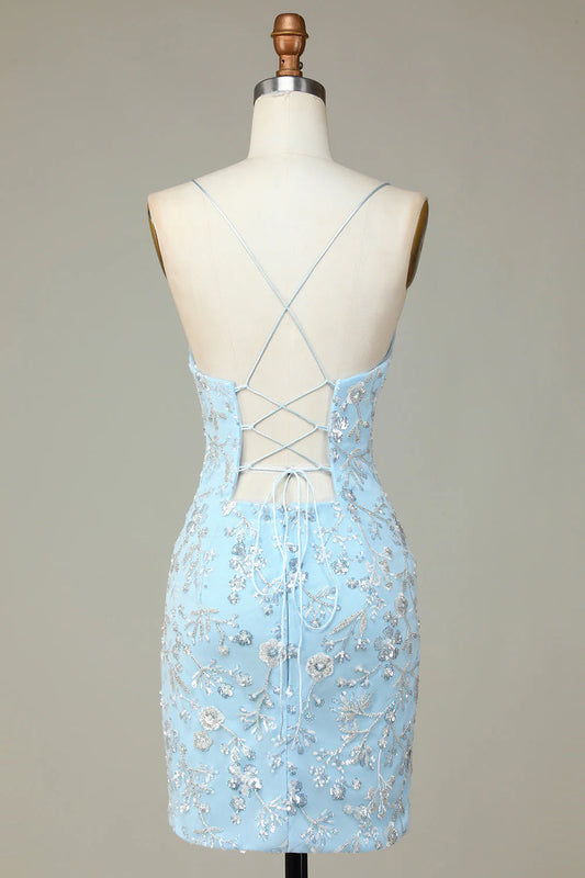 Amzcw Sparkly Blue Sheath Spaghetti Straps Backless Sequins Short Homecoming Dress