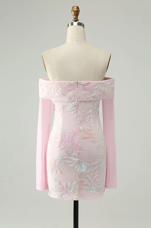 Amzcw Cute Sparkly Bodycon Off The Shoulder Sequin Pink Homecoming Dress with Long Sleeves