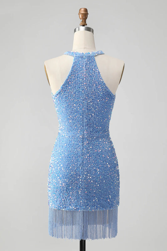 Amzcw Sparkly Blue Bodycon Halter Sequin Short Homecoming Dress with Tassels
