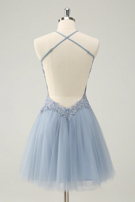 Amzcw Cute Dusty Blue A Line Spaghetti Straps Beaded Short Homecoming Dress with Appliques