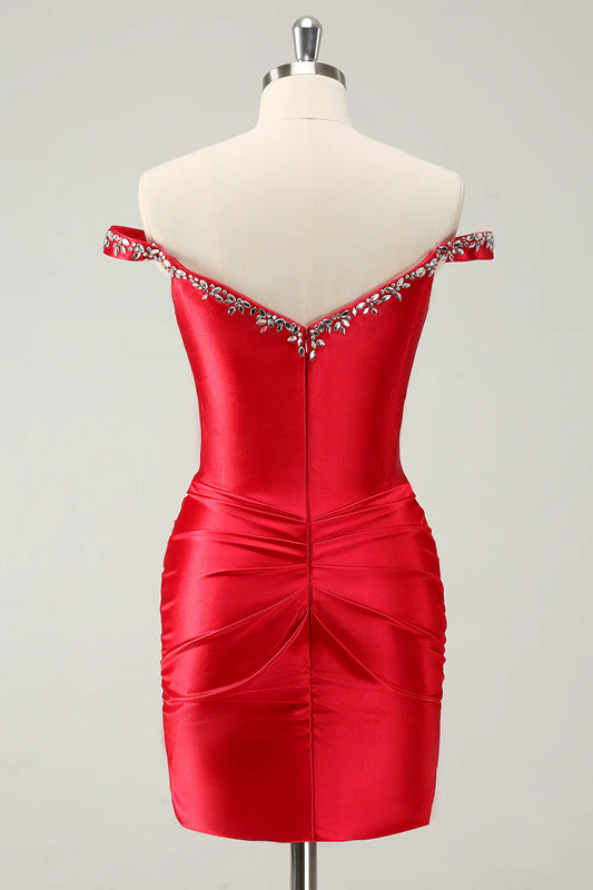 Amzcw Red Sheath Off The Shoulder Pleated Corset Short Homecoming Dress with Rhinestones