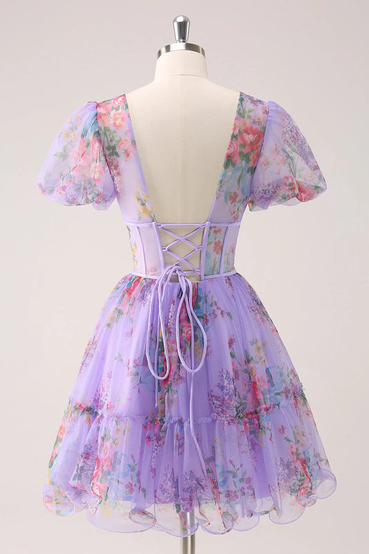 Amzcw Purple A-Line V Neck Corset Floral Homecoming Dress with Lace Up Back