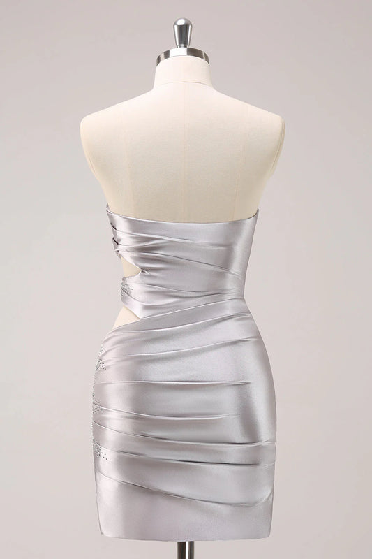 Amzcw Silver Hollow Out Strapless Pleated Tight Metallic Homecoming Dress with Beading