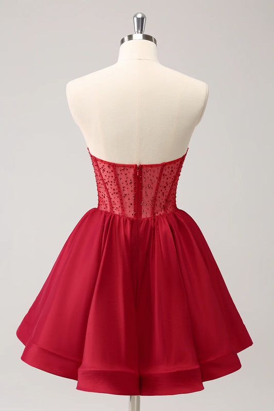 Amzcw Cute Red A Line Strapless Corset Ruffle Homecoming Dress with Beading