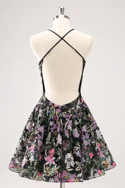 Amzcw Sparkly Black A Line Floral Short Homecoming Dress with Sequins