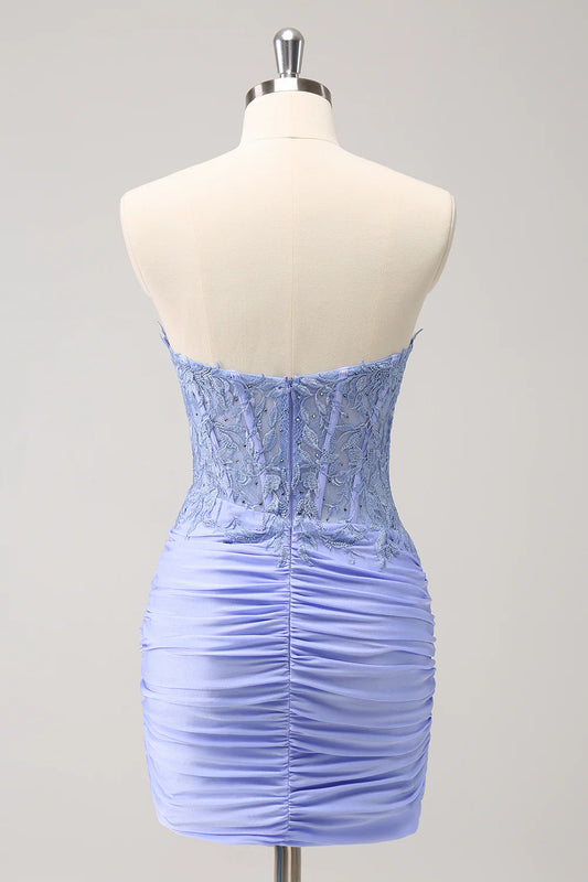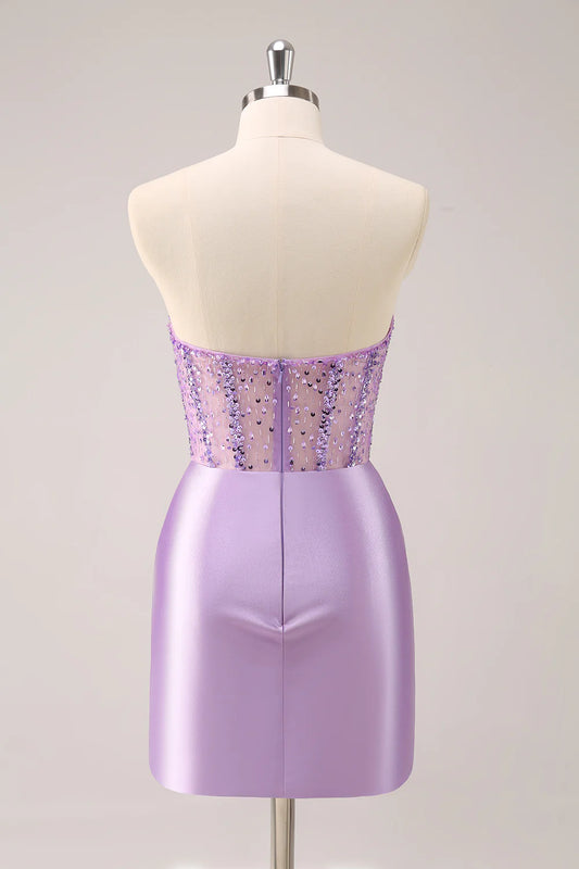 Amzcw Sparkly Lilac Bodycon Strapless Sequins Ruched Short Homecoming Dress with Beading
