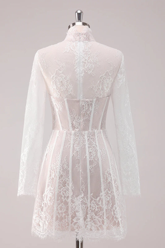 Amzcw White Lace A Line High Neck Corset Short Homecoming Dress with Long Sleeves