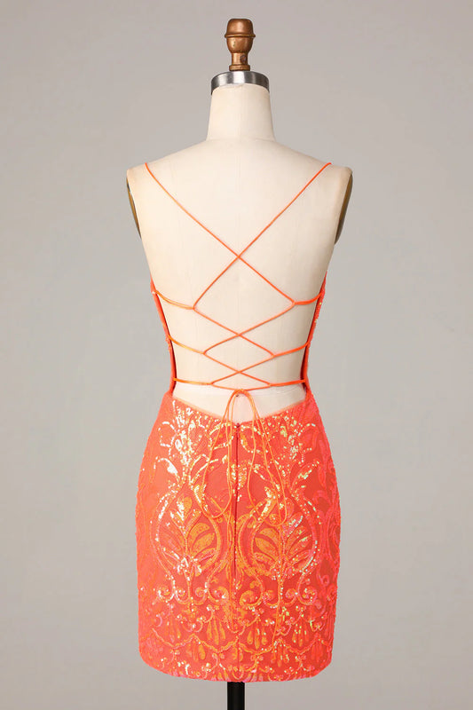 Amzcw Sparkly Orange Bodycon Spaghetti Straps Sequins Short Homecoming Dress