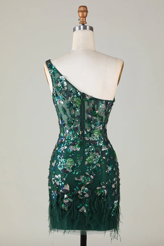 Amzcw Dark Green Sheath One Shoulder Sequins Short Homecoming Dress with Feather