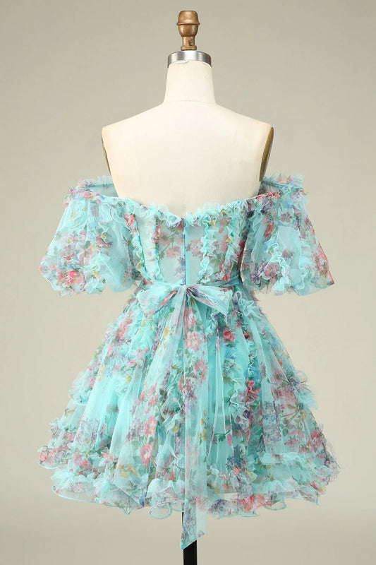 Amzcw Cute A Line Off the Shoulder Green Tulle Short Homecoming Dress with Short Sleeves