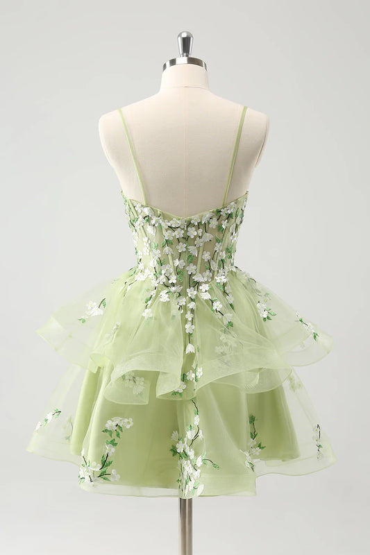 Amzcw Floral Light Green A Line Spaghetti Straps Corset Short Homecoming Dress with Appliqued