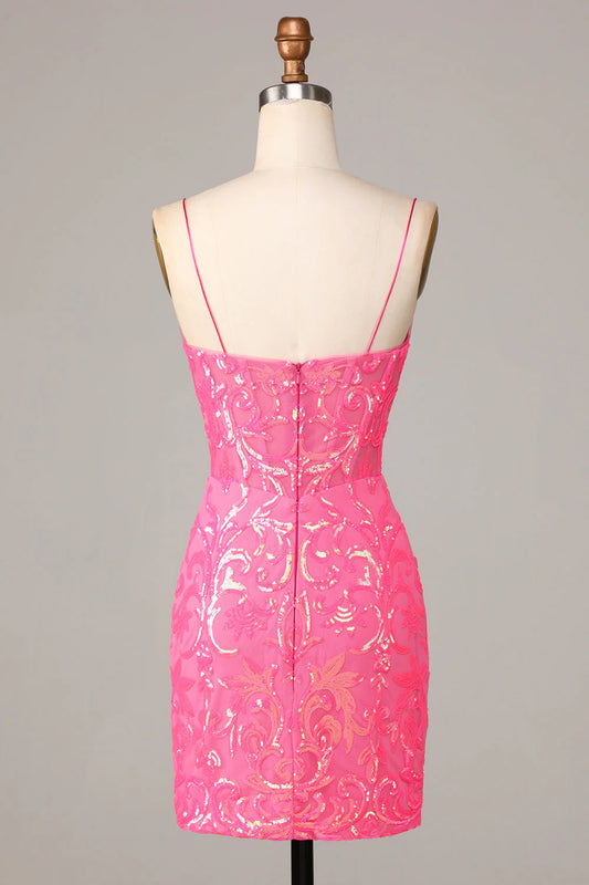 Amzcw Amazing Sheath Fuchsia Spaghetti Straps Sequins Homecoming Dress
