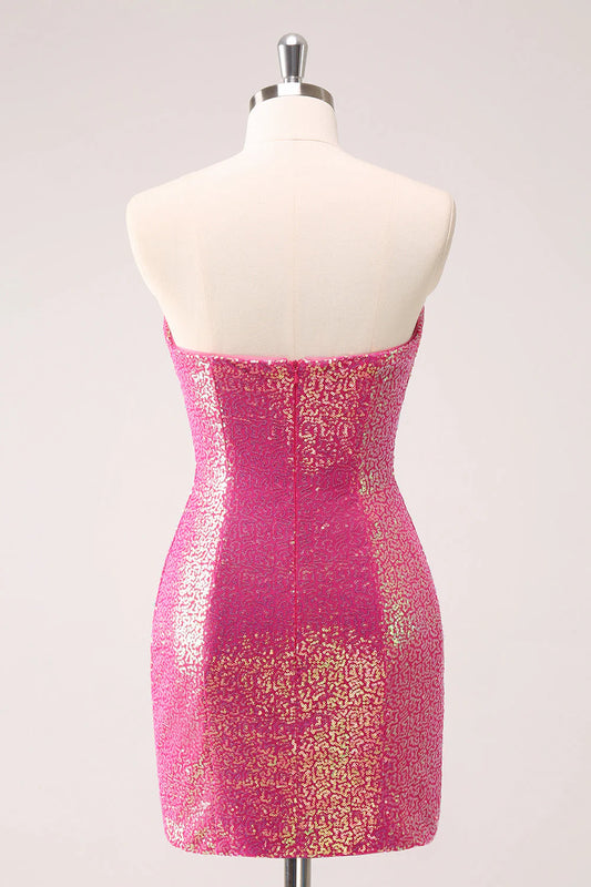 Amzcw Sparkly Fuchsia Bodycon Strapless Hollow Out Sequins Short Homecoming Dress with Slit