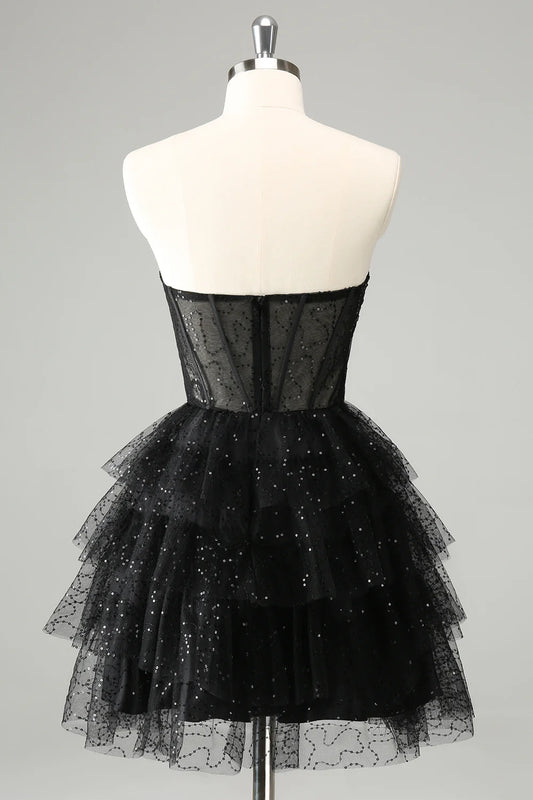 Amzcw Black A Line Strapless Tiered Corset Homecoming Dress