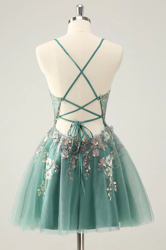 Amzcw Glitter Grey Green A Line Spaghetti Straps Sequins Homecoming Dresses with Appliques