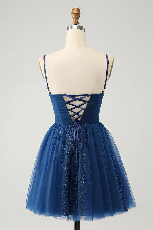 Amzcw Glitter Navy A Line Spaghetti Straps Pleated Tulle Short Homecoming Dress with Sequins