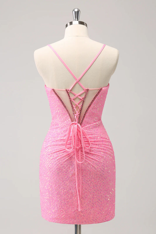 Amzcw Stylish Sparkly Unique Pink Tight Sequin Corset Homecoming Dress with Lace Up Back