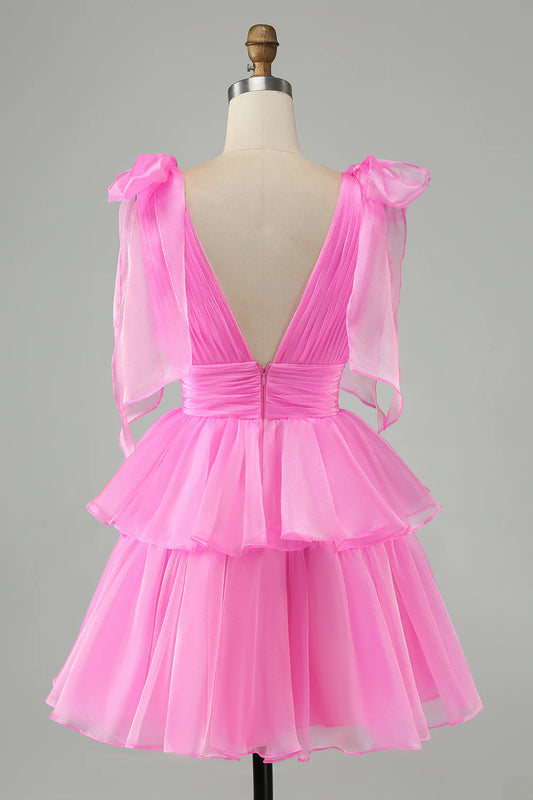 Amzcw Cute Hot Pink A Line V Neck Backless Pleated Tiered Short Homecoming Dress