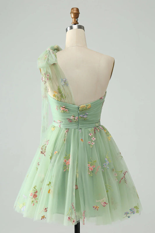Amzcw Light Green A Line One Shoulder Tulle Homecoming Dress with Floral Embroidery