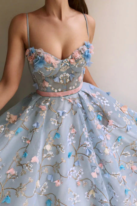 A Line Spaghetti Straps Sweetheart 3D Flower Applique Sky Blue Prom Dresses