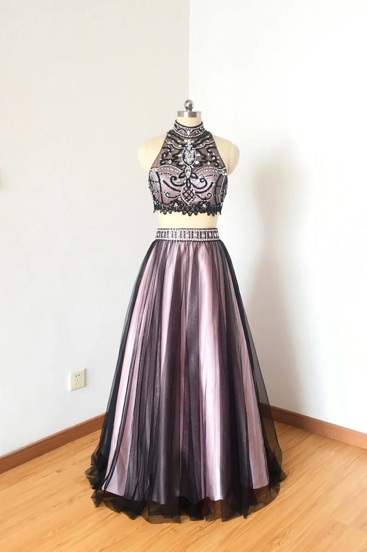 Full Length Sexy Tulle Beads Sleeveless A line Coffee Tulle Two Piece Prom Dresses