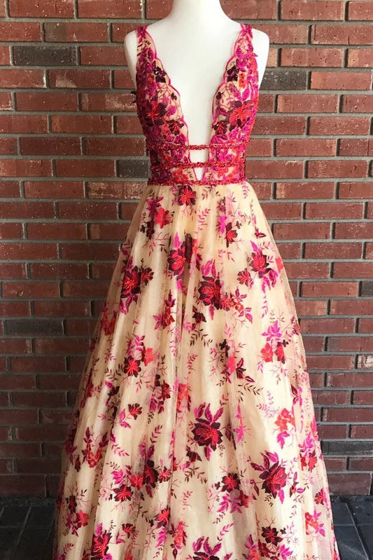 A Line Lace V Neck Red Floral Sexy Long Prom Dresses Simple Evening Dresses