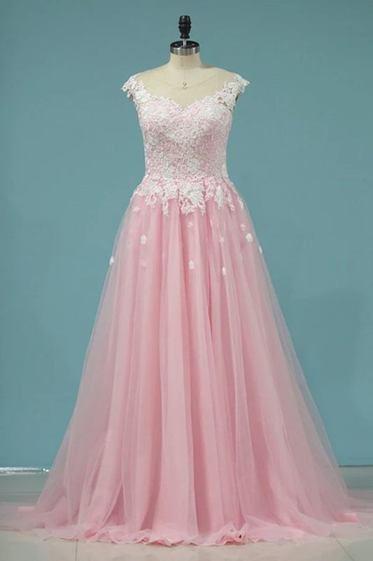 Tulle Prom Dresses Scoop With Applique A Line Sweep Train