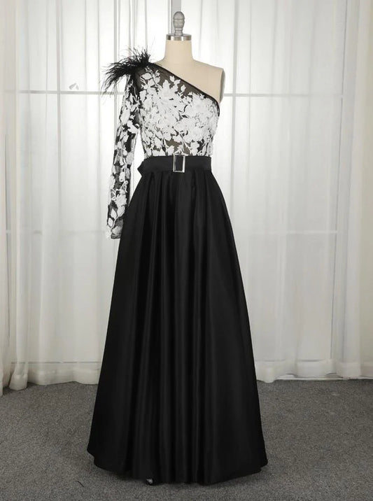 A Line Satin One Shoulder Long Sleeves Split Pockets Prom Dresses With Applique