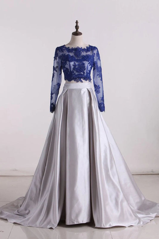Elegant Blue Two Piece A-line Scoop Long Sleeve Elastic Satin Floor-Length Prom Dresses