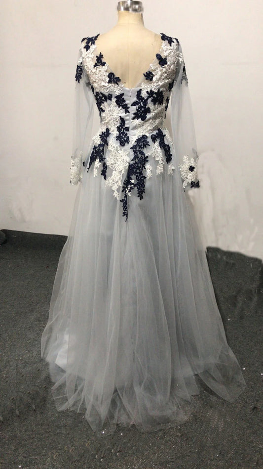V-neck long sleeves see-through handmade flowers A-line Prom Dresses