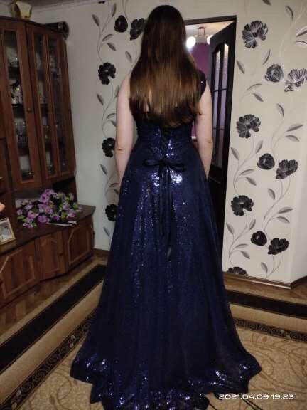 Sexy One-Shoulder Prom Dresses A Line Navy Blue Sequined Cheap Prom Dress with Split