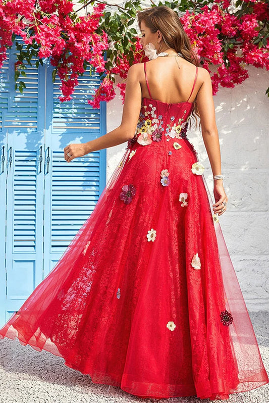 V-Neck Sleeveless Floor-Length Flower Tulle Prom Dresses