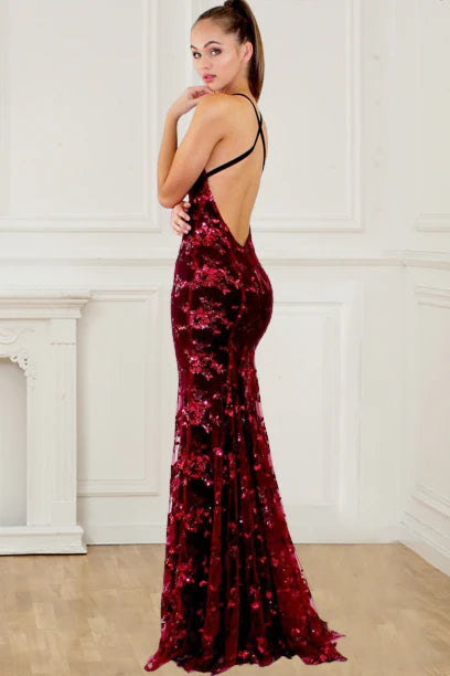 Fashion Spaghetti Straps Burgundy Sequin Mermaid Backless Deep V Neck Prom Dresses