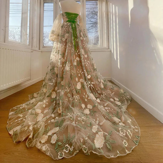 A line Tulle Appliques V Neck Prom Dresses with Long Sleeves