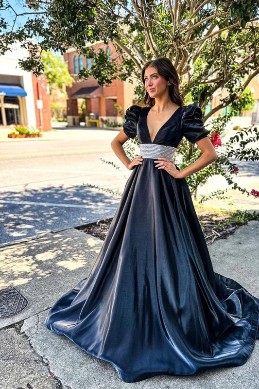 A-Line Beaded Plunge V Neck Long Prom Dress with Puff Sleeves