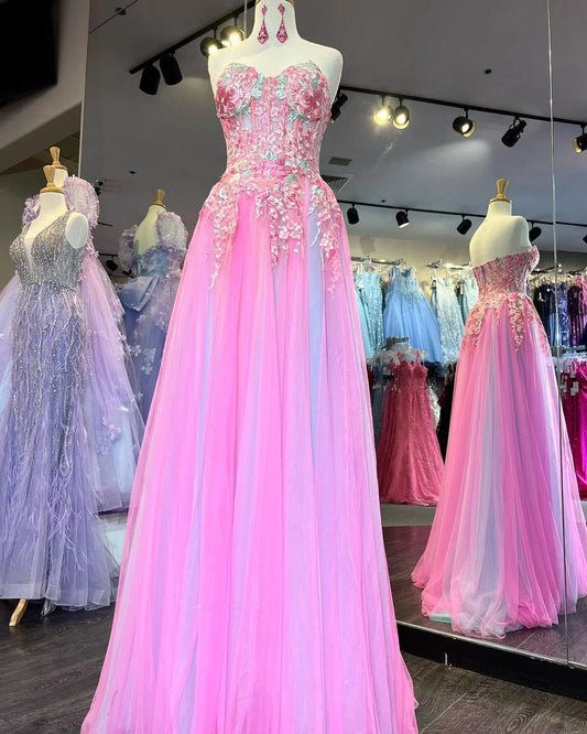 A Line Strapless Tulle With Applique Floor Length Prom Dresses