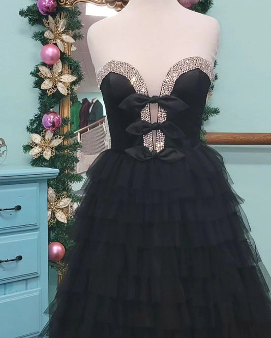 A-Line Strapless Tiered Tulle Satin Long Prom Dress