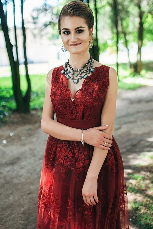 Burgundy Prom Dresses V Neck Straps Long Lace Appliques Mother Of The Bride Dresses