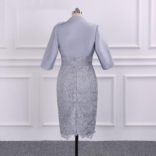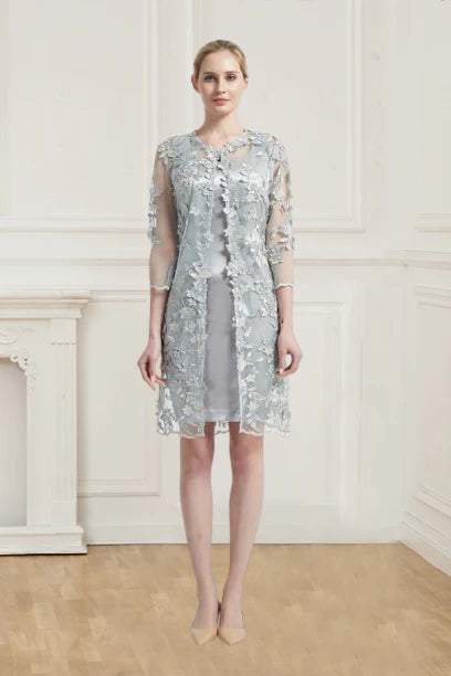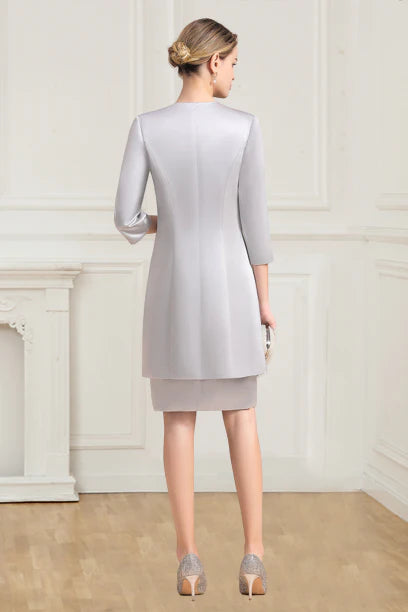 Two Piece Scoop 3/4 Sleeves Short Silver Sheath Mother of the Bride Dress with Jacket