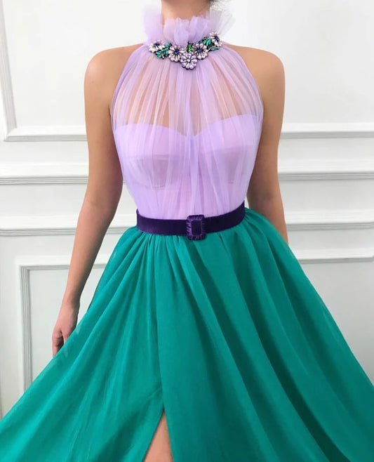 Elegant A Line Chiffon Open Back Halter Slit Tulle Long Cheap Prom Dresses