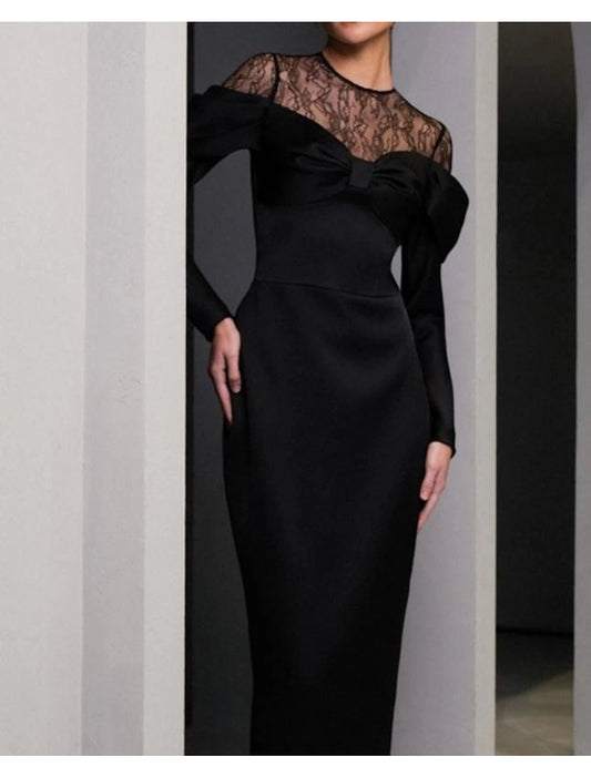 Sheath / Column Mother of the Bride Dress Formal Wedding Guest Elegant Party Scoop Neck Floor Length Satin Lace Long Sleeve with Bow(s)