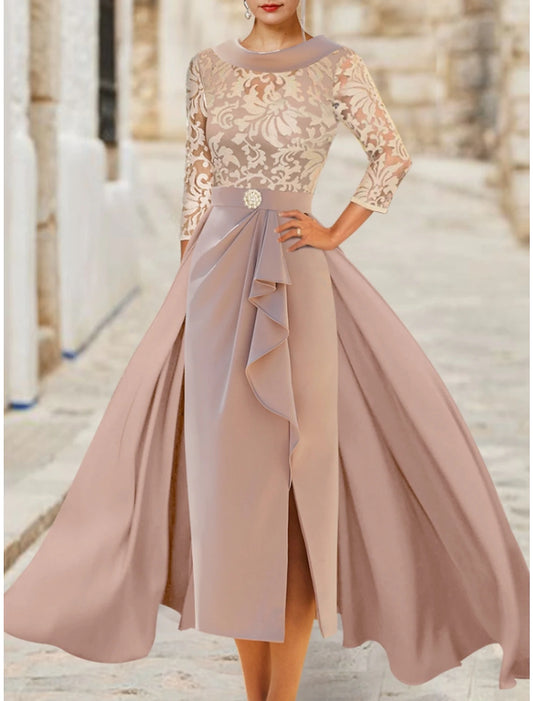 Two Piece Sheath / Column Mother of the Bride Dress Formal Wedding Guest Elegant Jewel Neck Tea Length Stretch Fabric 3/4 Length Sleeve with Lace Appliques