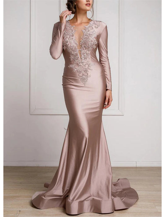 A-Line Sheath / Column Mother of the Bride Dress Simple Elegant Jewel Neck Floor Length Italy Satin Long Sleeve No with Ruched Appliques